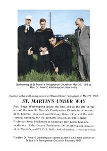 Meanwhile, on November 13, 1955, St. Martin’s held their first service in the Manor Park Public School. St. Martin’s Church was built at 444 St. Laurent Blvd. The Reverend Dr. Peter C. Wotherspoon was inducted as Minister of St Martin’s on February 1, 1957.